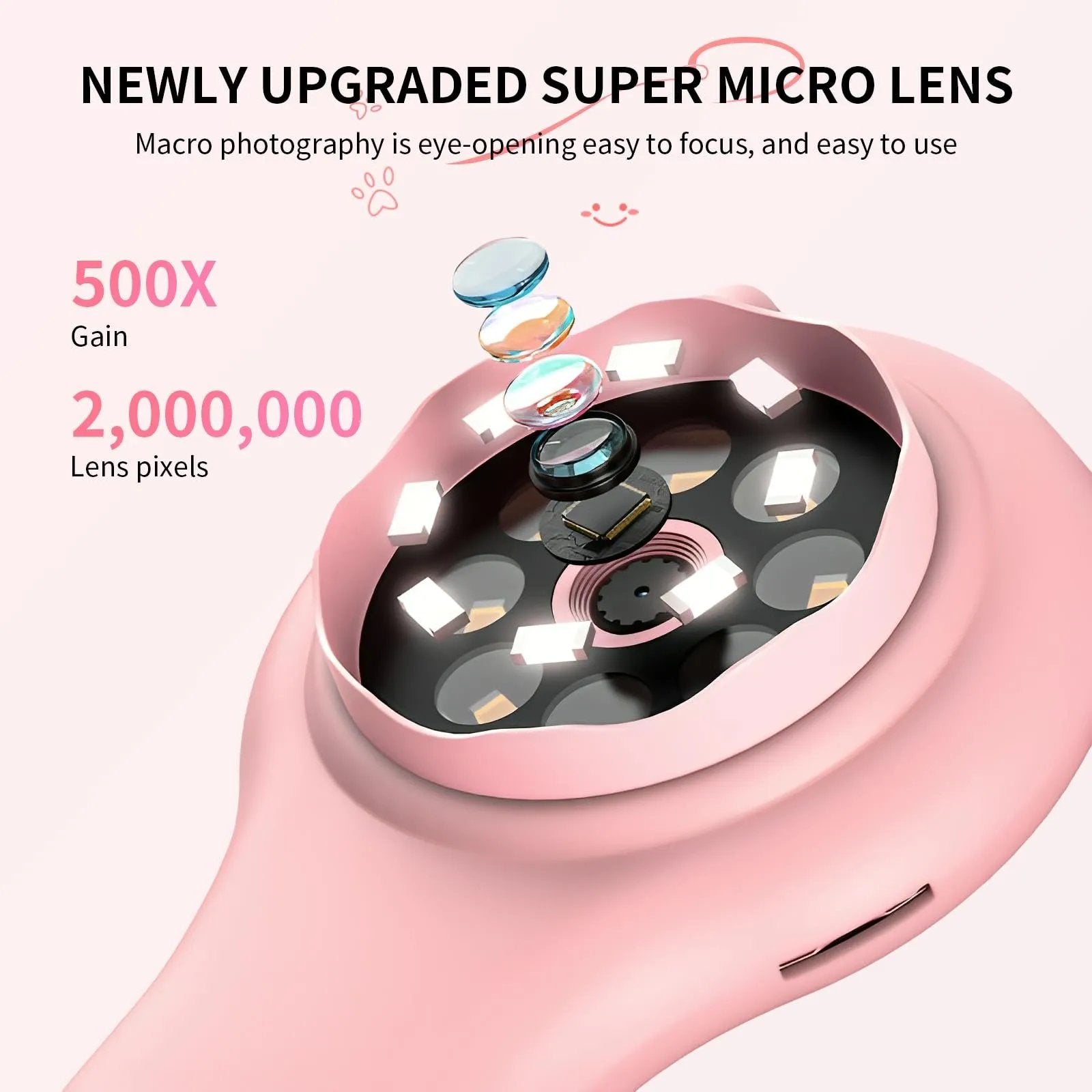 Kid's Portable Magnifying Glass: Equipped with a 2-inch IPS high-definition display screen and a circular aperture magnifying glass, the back is equipped with three adjustable levels of 8 LED lamp beads, designed to fit children's grip size. This magnifying glass adopts both optical and electronic imaging methods, allowing children to explore the microscopic world in multiple ways