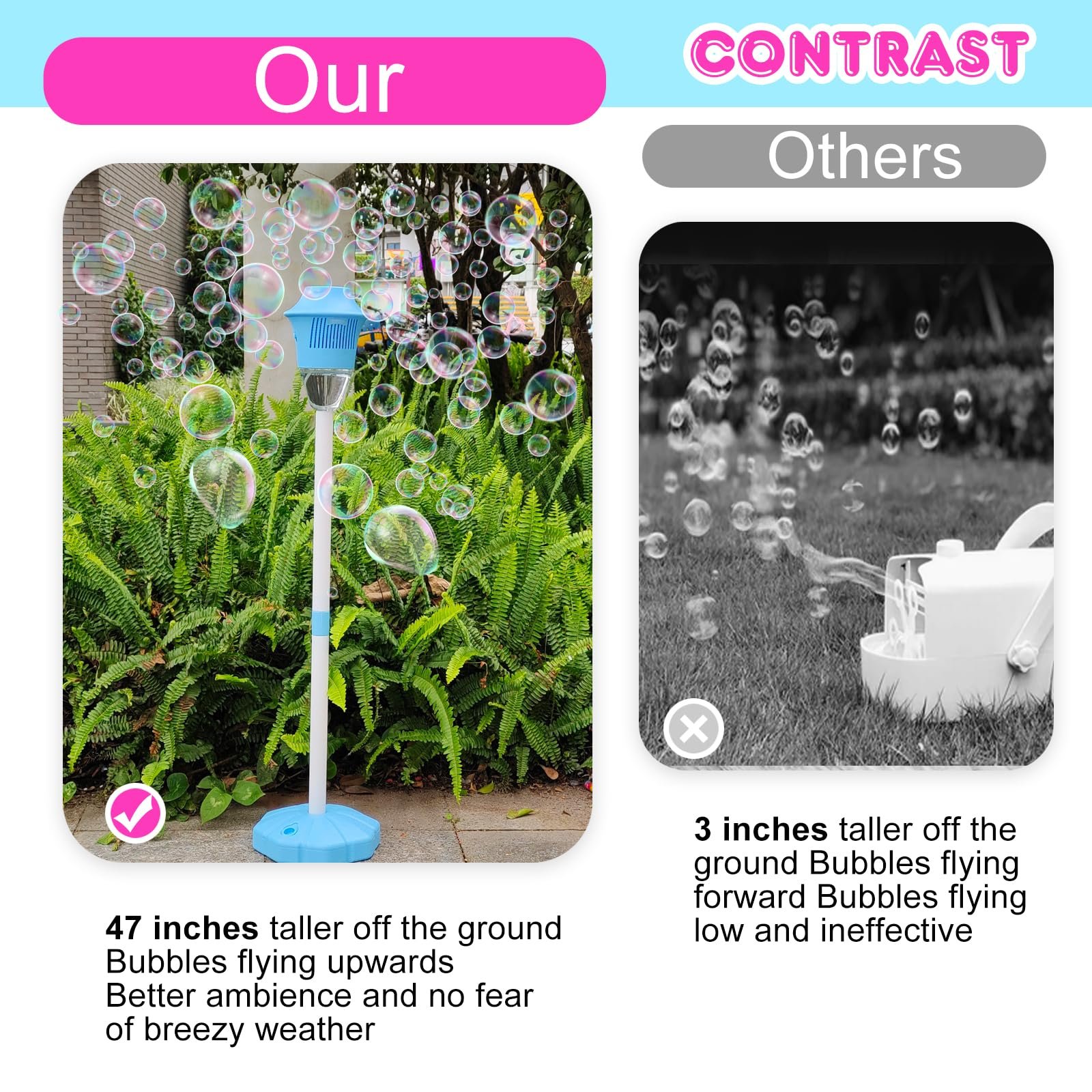 Unimaginable Atmosphere Experience: imagine that at an outdoor party, wedding or celebration, this vertical bubble machine releases colorful bubbles that float into the sky with the breeze, creating a dreamy atmosphere. Compared to ordinary bubbles machine, it does not need to be placed on a table, and uses its 47-inch height advantage to blow bubbles into the sky, creating a more spectacular visual effect, making every kids attending the event feel as if they were in a fairy tale world.