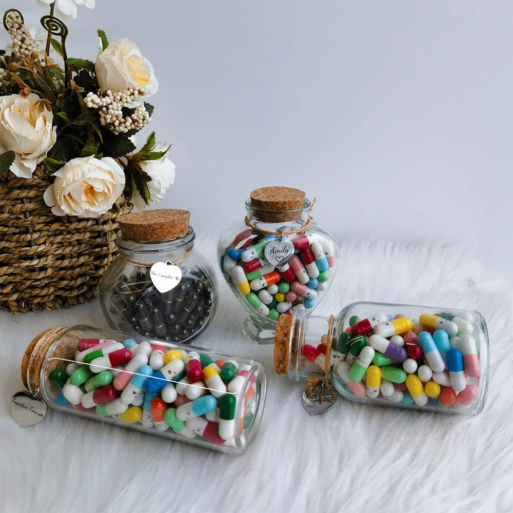 1. 1 glass bottle. 50 or 100 cute capsules. each capsule has a letter paper in it. No information on the paper.