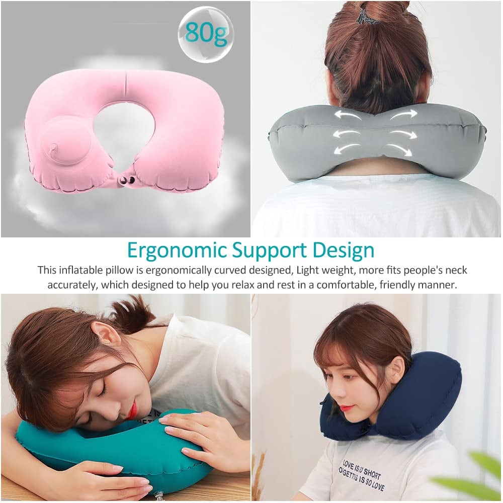 NO-BLOW DESIGN: This neck pillow airplanes features a no-blow design, so all you need to do is gently press the built-in pump repeatedly, and it takes only about 30 seconds to inflate. This keeps the pillow clean and hygienic while avoiding the embarrassment of blowing through the mouth in public!