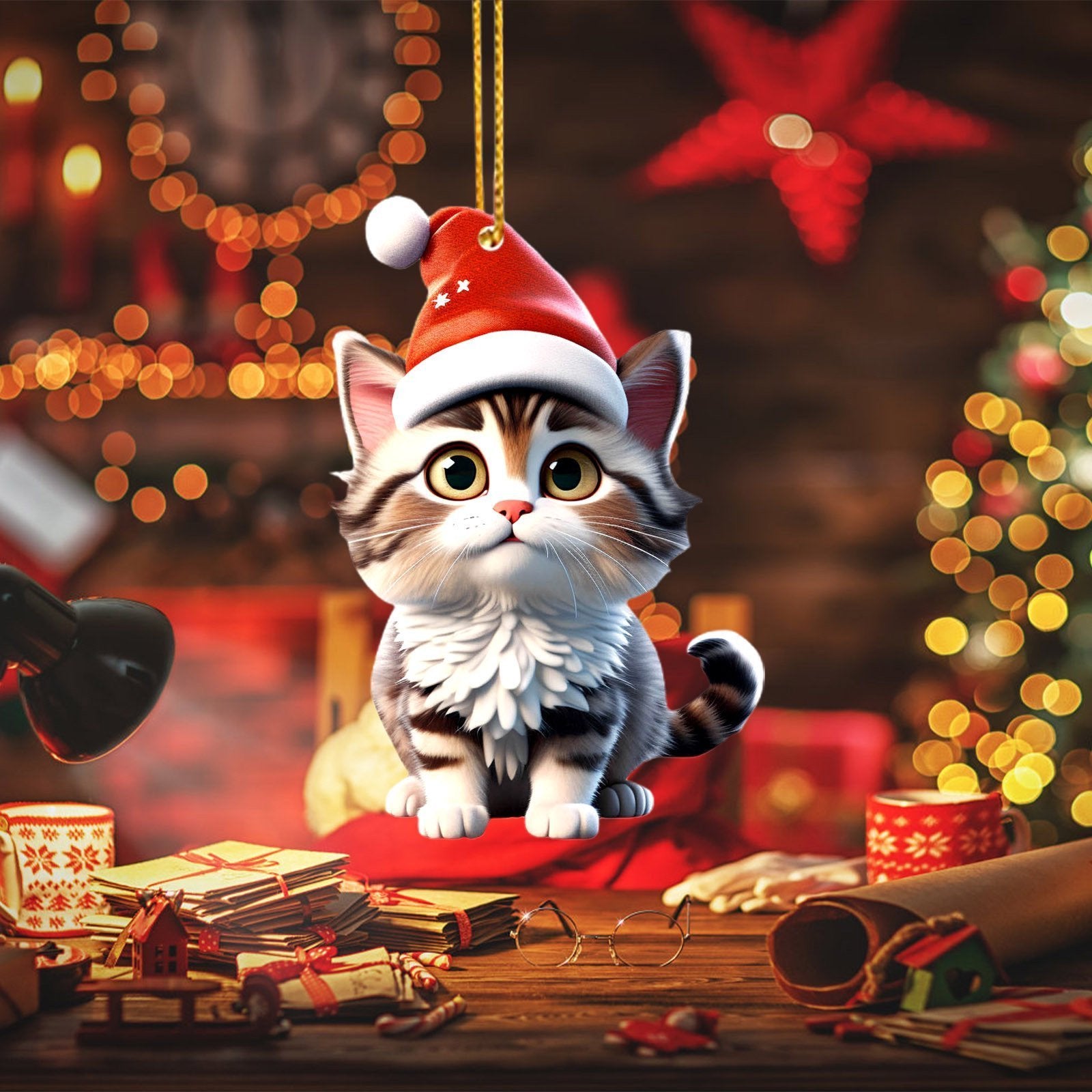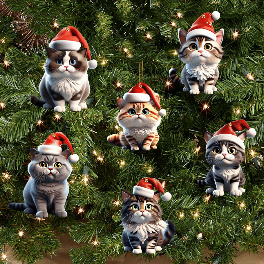 Each ornament features a different playful cat 🐱 wearing a bright red Santa hat 🎅, adding a whimsical and unique touch to your Christmas decorations.