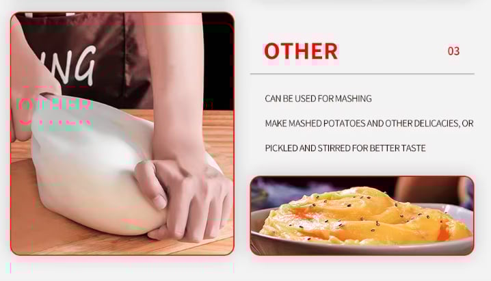 This silicone dough bag can easily prepare all kinds of food, such as bread, dumpling skin, etc., saving your time and energy in the kitchen. When marinating meat or fish, pour in the ingredients, tie the bag and pour into the refrigerator. It can also be used to press fruits and vegetables to make puree. It can also be used to store food and drinks.