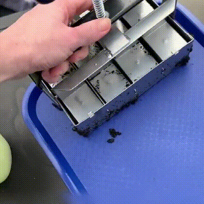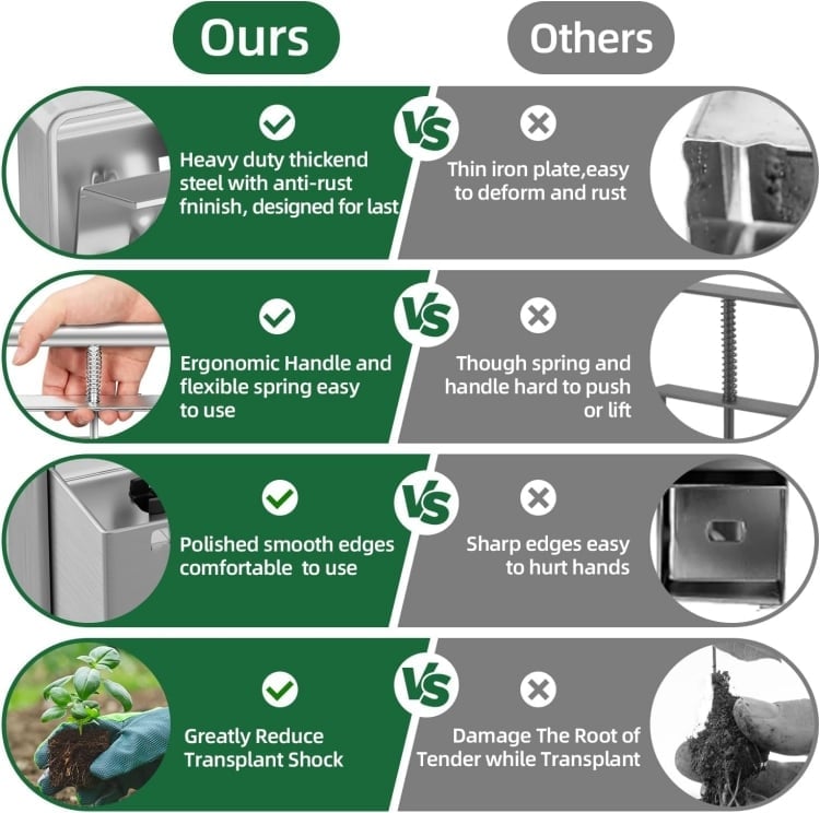 Soil Block Maker is made of refined zinc-coated steel, sturdy without deformation for long-term recycling use, allowing you to quickly make eight 2-inch soil blocks with seed holes and easily pushing them out, just like a "pot-less" pot, offering a comfortable and labor-saving soil blocking experience while enabling you to efficiently cultivate vigorous rooted seedlings without the need for plastic containers.