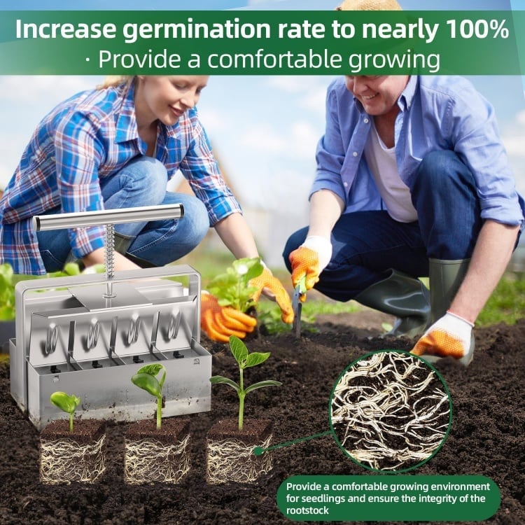 Our soil blocker helps seeds grow on soil blocks directly, serves as both the container and the growing medium for a transplant seedling, minimizes damage to fragile root systems during transplanting and establishes an ideal growth environment for seed starting to improve germination rate, is the perfect replacement for plastic pots and cell trays. Effectively prevent transplant shock, stunting, slow growth, or root-binding.