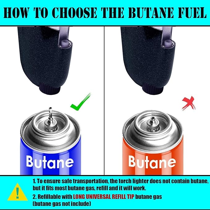 - ๐ฅใEASY TO OPERATE & REFILL DESIGNใ - Fill the lighter with BUTANE only (butane gas NOT included) . Turn the lighter upside down so the bottom faces upwards and it's top rests on your work surface. Insert the grommet covered tip of the applicator into the refill valve. The lighter is reusable. Press down on the bottle to disengage the refill bottle's release valve.