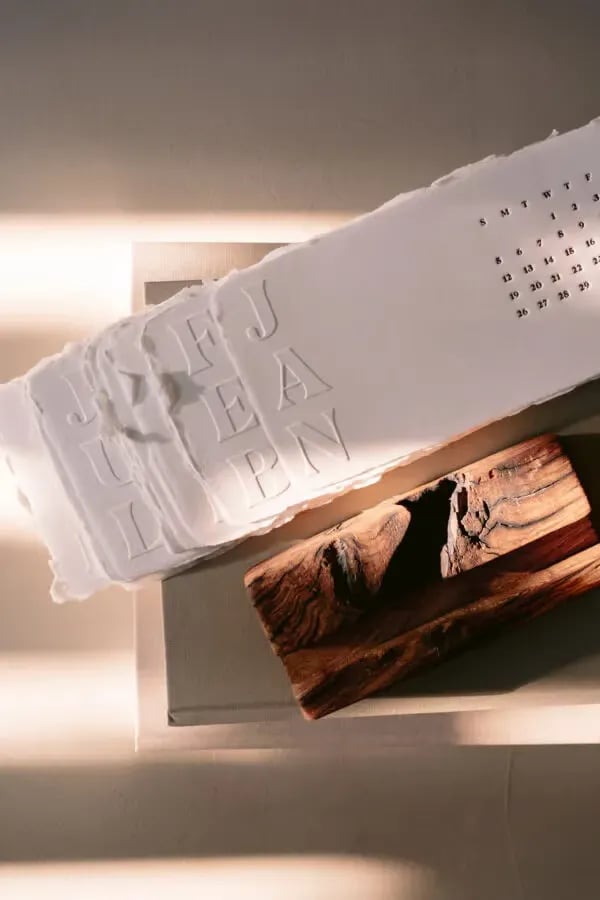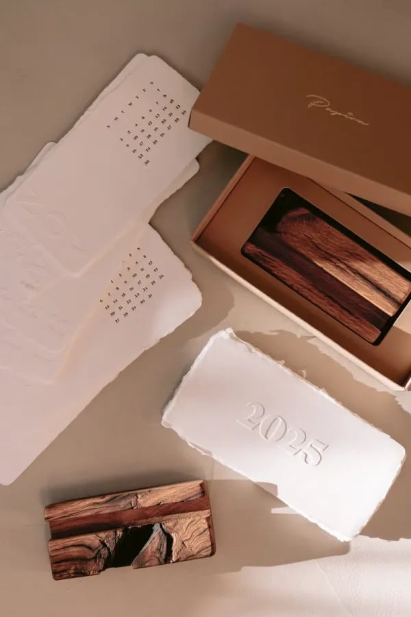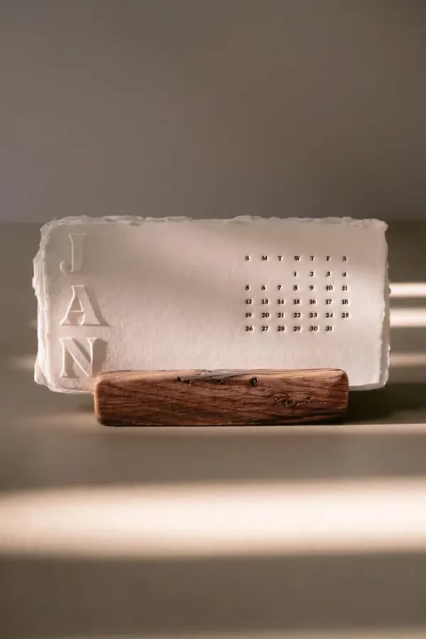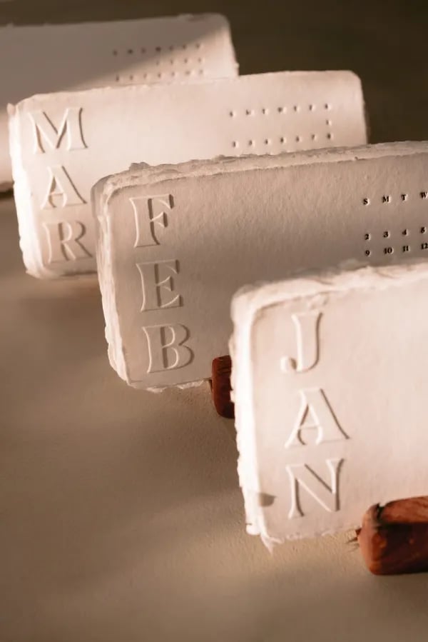 OurĀ Handmade Desk CalendarĀ is a true work of art, designed to elevate your space with its stunning, raw deckled edges and rich textures. Each page is carefully made fromĀ handmade paper, ensuring no two are alike. TheĀ blind embossingĀ andĀ letterpress printingĀ techniques create aĀ special tactile experienceĀ as you flip through the months, offering a satisfying, textural sensation that grows more beautiful with time. šæšļø