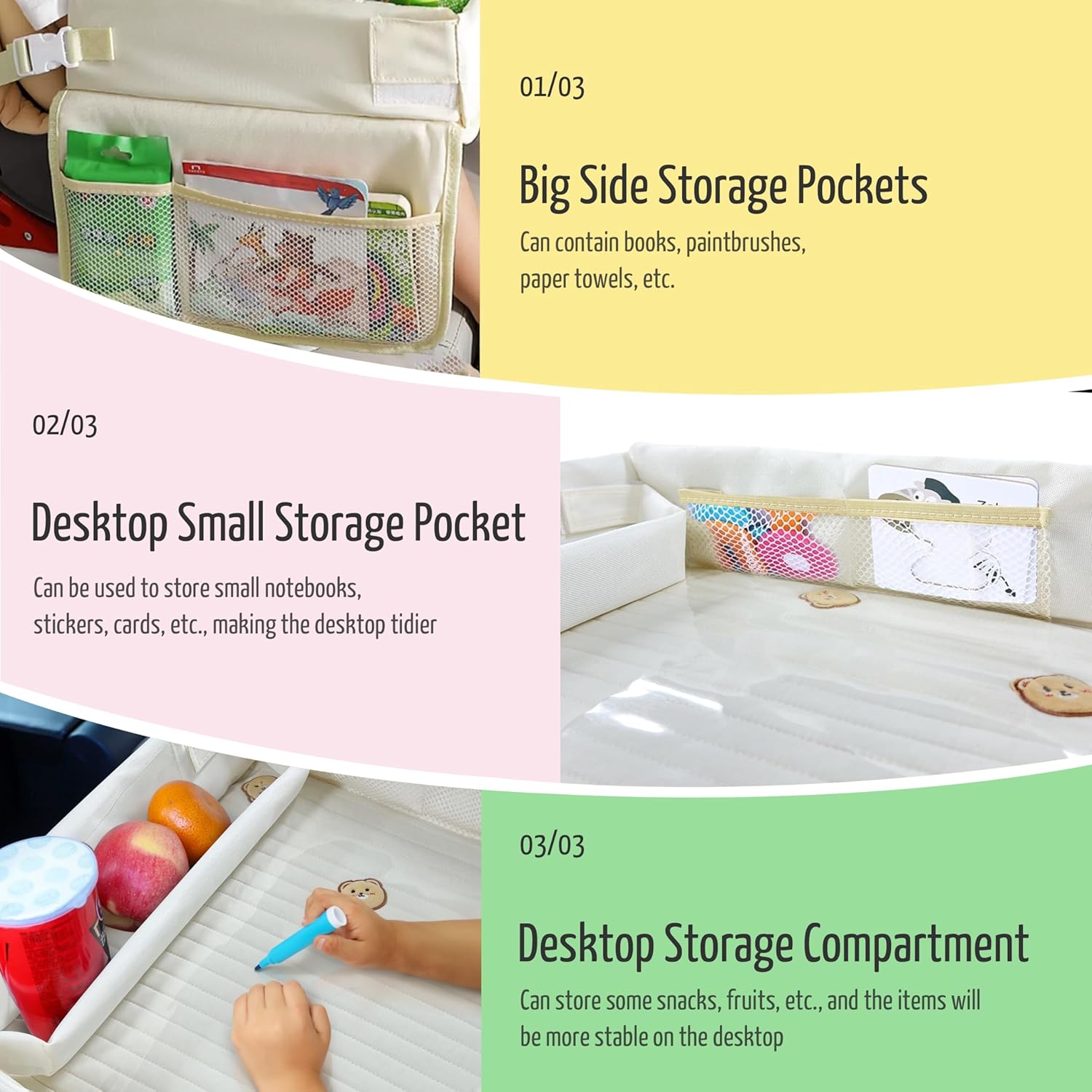 Durable and easy to clean - Oxford material ensures lightweight and tough quality. The surface of the product adopts a wipeable panel, which means that any traces left by children eating or drawing on it can be easily wiped off without worrying about stains and difficult cleaning.